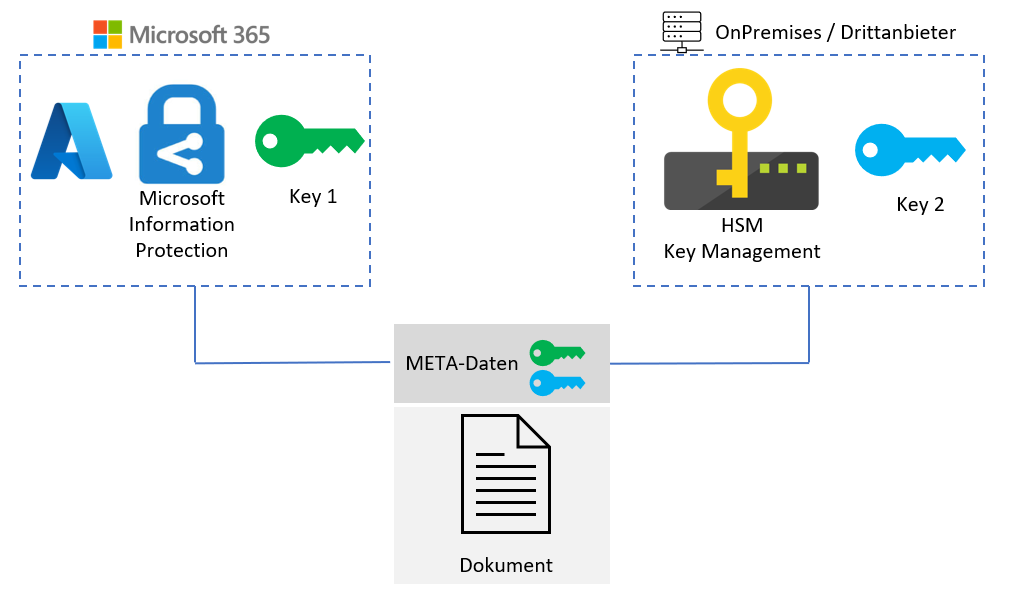 Seit einigen Monaten gibt es genau dafür einen Lösungsansatz von Microsoft: das sogenannte Double Key Verfahren. Durch eine Verschlüsselung mit 2 Keys von verschiedenen Quellen wird sichergestellt, dass nur mit beiden auf das Dokument zugegriffen werden kann. Einer der Schlüssel wird wie sonst auch von Microsoft bereitgestellt. Der zweite Schlüssel ist vollständig in der Obhut des Kunden. Das dafür notwendige System muss entweder im eigenen Rechnezentrum in Form einer Appliance bereit gestellt werden oder kann bei spezialisierten Anbietern auch als SaaS Applikation bezogen werden. Über Microsoft Information Protection erfolgt dann die Verknüpfung mit dem Dienst und Dokumente können über die sog. Sensitivity Labels mittels der DKE Option doppelt verschlüsselt werden.