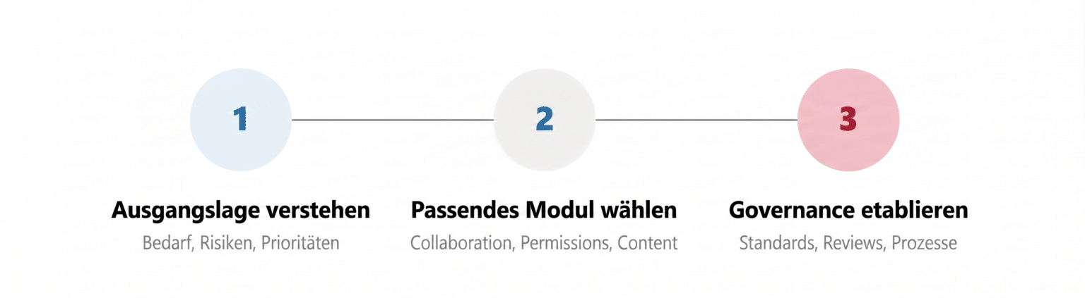 Gemeinsam identifizieren wir, wo in Ihrer Microsoft-365-Umgebung der grösste Handlungsbedarf besteht – bei Zusammenarbeit, Plattform-Governance oder Inhaltsqualität.